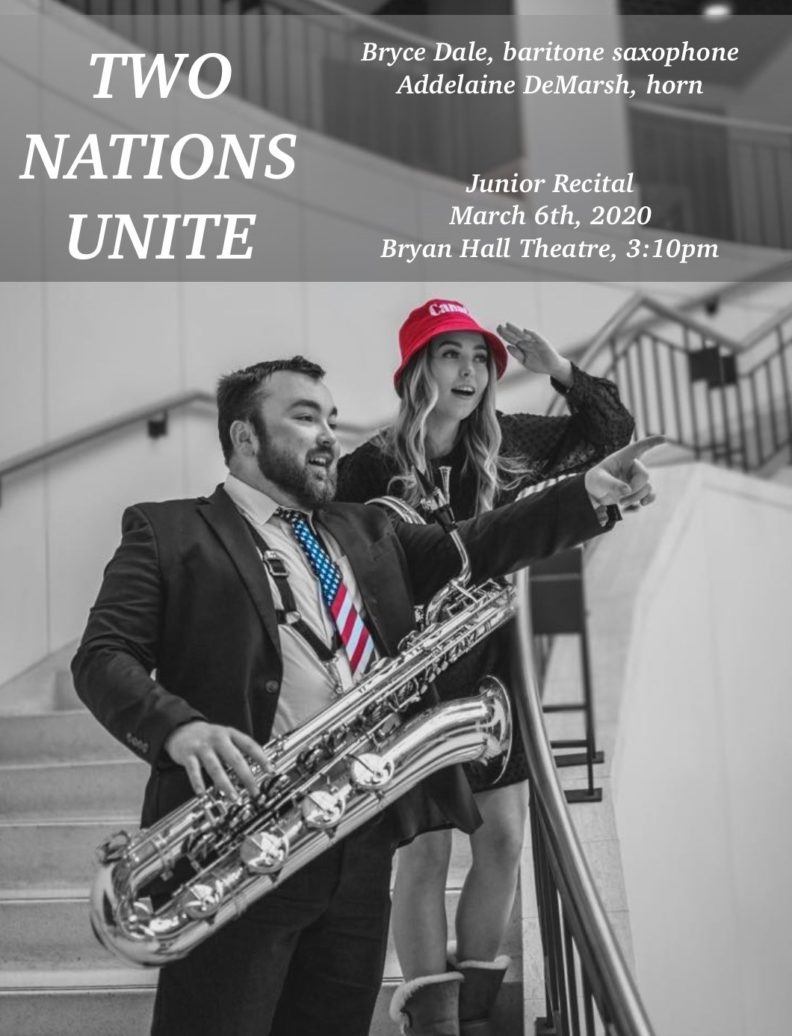 Performance Student Recital: Bryce Dale, baritone saxophone and Addelaine DeMarsh, horn + LIVESTREAM Friday, March 6, 2020 - add to calendar 3:10-5 pm Bryan Hall This event will occur in Bryan Hall Theatre View location in Google Maps WATCH LIVE! About the event CONCERT PROGRAM Contact Michelle White michellew@wsu.edu (509) 335-7696