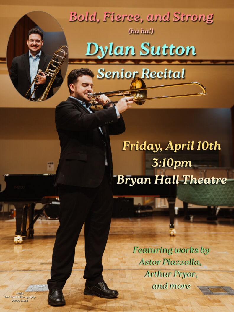 Performance Student Recital: Dylan Sutton, trombone Friday, April 10, 2026 - add to calendar 3:10-4 pm Bryan Hall This event will occur in Bryan Hall Theatre. View location in Google Maps Watch Live! About the event Program: Link will open in this tab. Contact Blaine Ross blaine.ross@wsu.edu (509) 335-4148