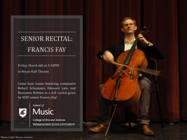 Come hear music featuring composers Robert Schumann, Edouard Lalo, and Benjamin Britten in a full recital given by WSU senior Francis Fay!