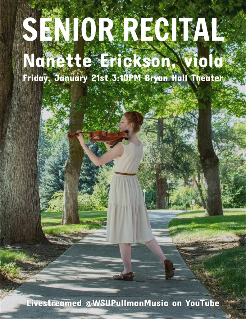 Student Recital – Nanette Erickson Friday, January 21, 2022 - add to calendar 3:10-4:10 pm Bryan Hall This event will occur in Bryan Hall Theatre. View location in Google Maps WATCH LIVE About the event Nanette Erickson, viola and Yoon-Wha Roh, piano. Contact Michelle White michellew@wsu.edu (509) 335-7696