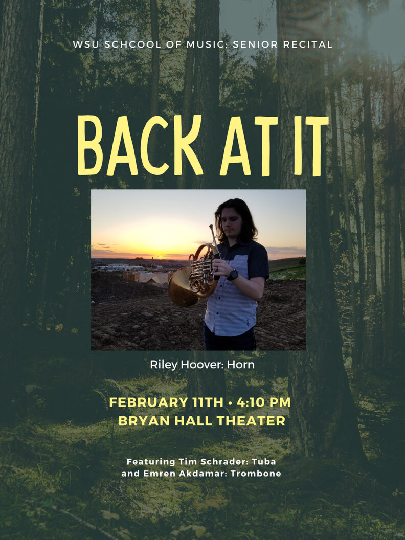 Join Riley Hoover for an evening of Paris Conservatory and othersuch French Horn solo music as well as two chamber pieces for Horn, Piano, and Tuba/Trombone. Riley’s Senior Recital is a must-see for exciting and aggressive brass playing.