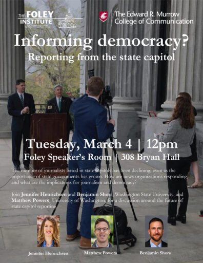 Join Jennifer Henrichsen and Benjamin Shors, WSU, and Matthew Powers¸University of Washington, talking about the crucial role that journalists play in reporting the news from state legislatures.
