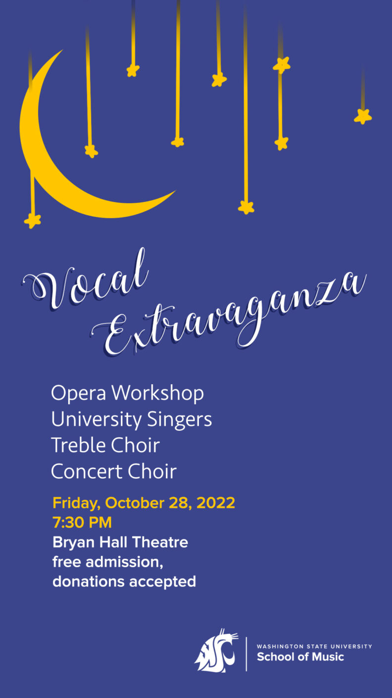 WSU’s annual Vocal Extravaganza will take place on Friday, October 28, 2022, at 7:30 pm in Bryan Hall Theatre. The event features the campus’s four vocal ensembles. Selected scenes from Jacques Offenbach’s operetta Orpheus in the Underworld will be performed by the students in Opera Workshop, under the direction of Dr. Julie Anne Wieck. The choral ensembles, conducted by Dr. Matthew Myers, will perform music about nighttime, stars, and rest. University Singers will perform pieces by Agathe Backer Grøndahl, Sarah Quartel, and Jacob Narverud; Treble Choir will sing music by B. E. Boykin, Joan Szymko, and Susan LaBarr; Concert Choir will perform works by Josef Rheinberger, Moses Hogan, Chen Yi, Eric Whitacre, and much more. All four groups will be accompanied by Elena Panchenko. The Vocal Extravaganza is free of charge and open to the public.