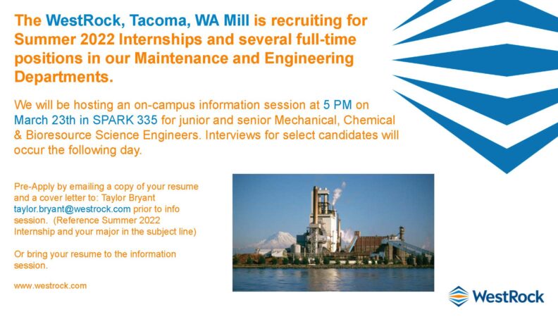 The WestRock, Tacoma, WA Mill is recruiting for Summer 2022 Internships and several full-time positions in our Maintenance and Engineering Departments.