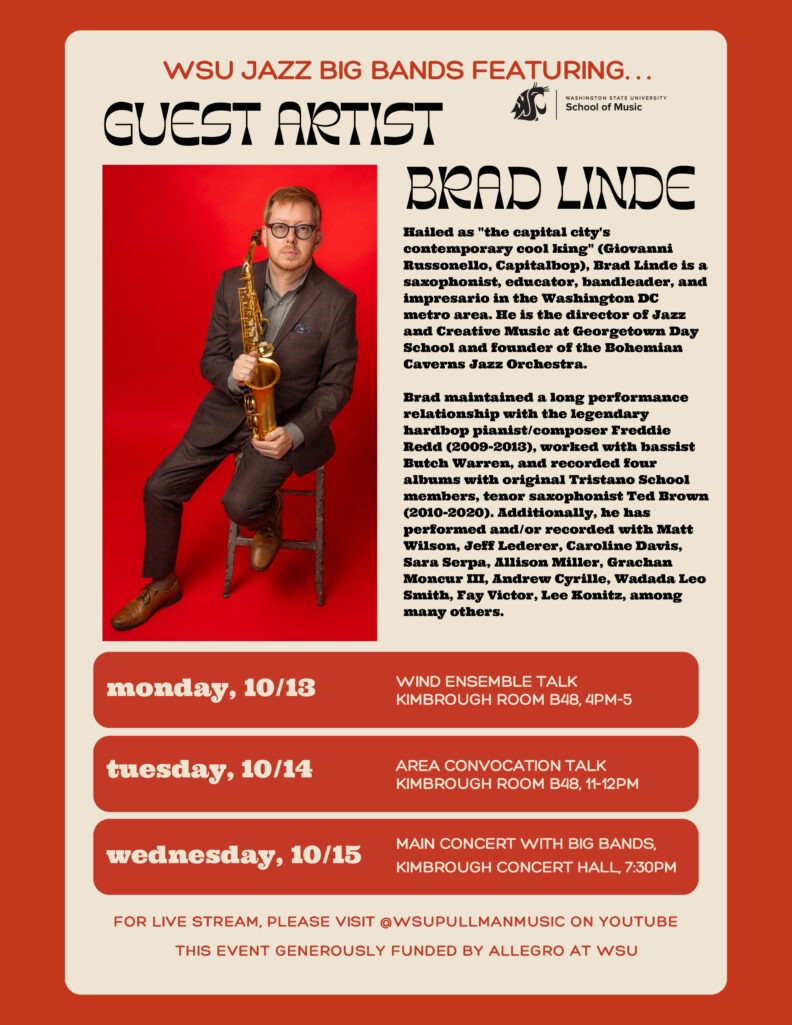 Hailed as “the capital city’s contemporary cool king” (Giovanni Russonello, Capitalbop), Brad Linde is a saxophonist, educator, bandleader, and impresario in the Washington DC metro area. He is the director of Jazz and Creative Music at Georgetown Day School and founder of the Bohemian Caverns Jazz Orchestra.